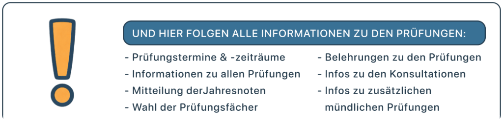 - Termine: Alle Termine bzgl. der Abschlussprüfungen sind auf unserer Homepage, im öffentlichen Kalender der Schule im Schulmanager sowie auf den entsprechenden Belehrungen (siehe unten, Punkte 5 & 6) zu finden.