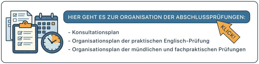 - Belehrung zu den mündlichen Prüfungen (+ Englisch sprachpraktisch): Die Belehrungen für die mündlichen Abschlussprüfungen finden durch die Klassenleitungen statt und sind von den prüfungsteilnehmenden per Unterschrift zu quittieren. Prüfungsteilnehmende, die am Tag der Belehrung nicht anwesend waren, werden durch ein Mitglied des Prüfungsausschusses nachbelehrt.