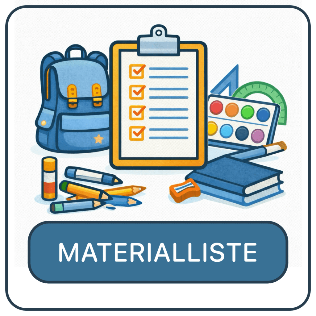 | Mathematik | 1 großes kariertes Heft (A4), 1 kleines kariertes Heft (A5), Schnellhefter A4 mit weißen & karierten Blättern, Geo-Dreieck, Schere, Klebestift, Zirkel, Lineal 30 cm, Buntstifte (mind. 5 Farben) |