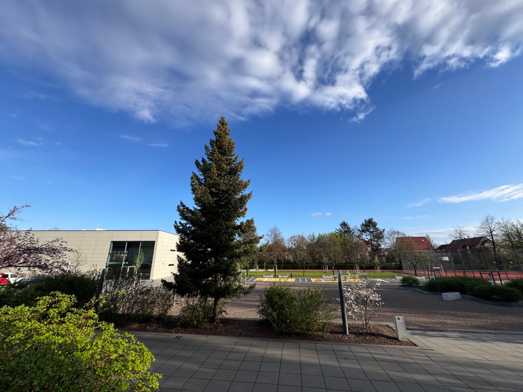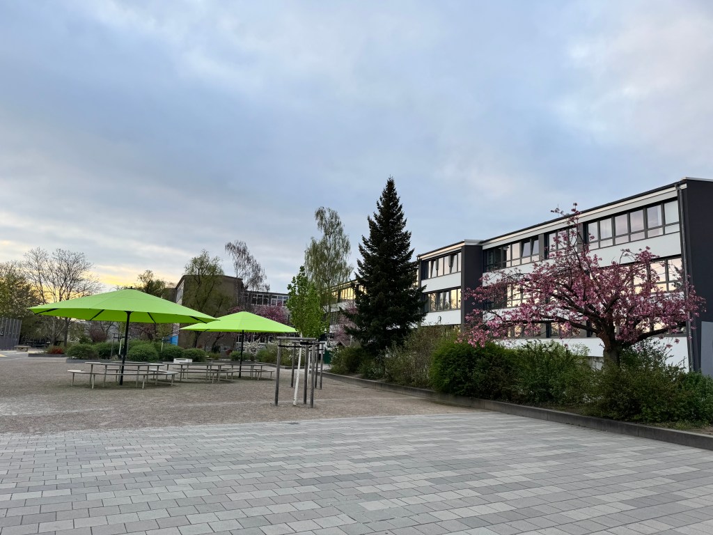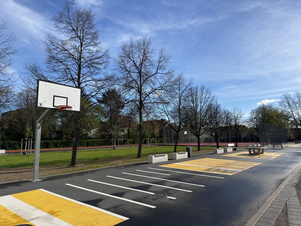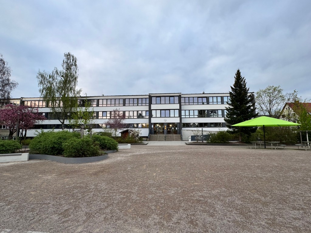 Das Außengelände der Schule umfasst eine großzügige Schulhoffläche von 1.500 m², die sowohl zum Verweilen als auch zur aktiven Pausengestaltung einlädt. Sitzgelegenheiten, Tischtennisplatten, ein Basketballfeld und ein Kleinfeldbereich für Fußball stehen den Schülerinnen und Schülern zur Verfügung.